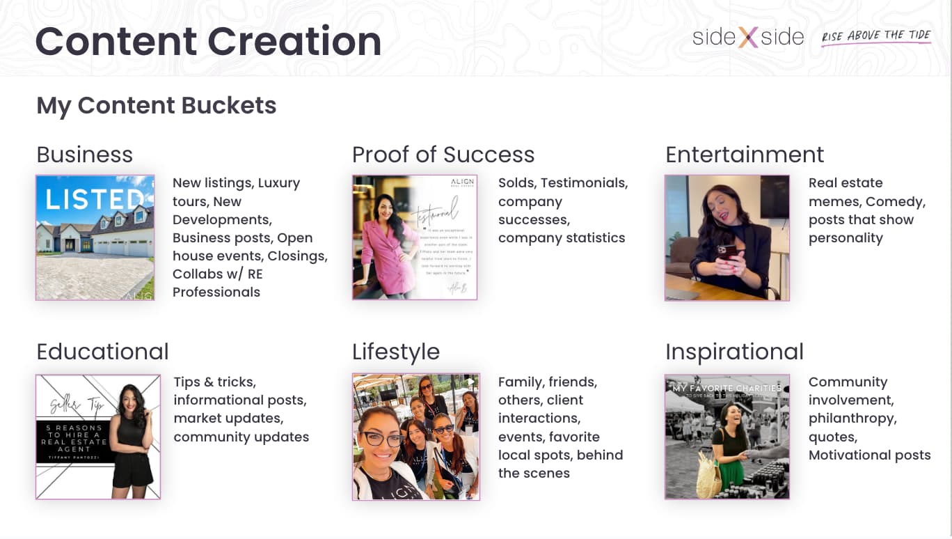 Tiffany has six buckets for her social channels: Business, proof of success, educate, inspire, entertain, and lifestyle. “In my business bucket, I could be posting about new listings, luxury tours, new developments, and open houses. In my lifestyle bucket, I could be posting about my family, my friends, client interactions, and local hotspots. There are so many ways you can fill these buckets and create new content that’s fresh and exciting.”
