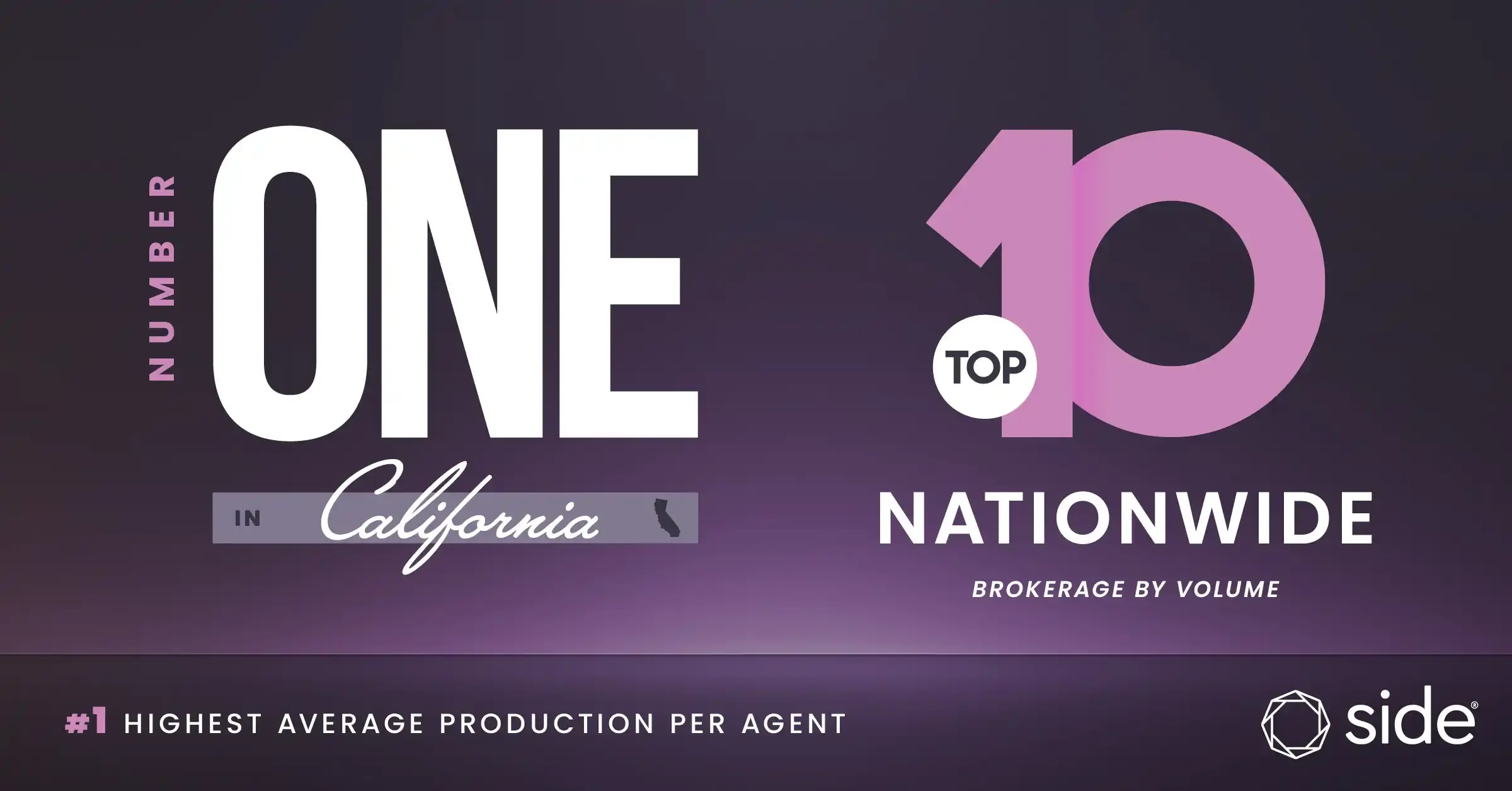 San Francisco, Calif. (April 4, 2025) — Side, the only real estate brokerage platform that helps top agents create and grow their own boutique companies, today announced that it has again been named the $9 largest brokerage by volume, while operating in just 18 states. Additionally, Side is recognized as the #1 California-based brokerage, and #1 in the nation for average production per agent compared to the other traditional brokerages.